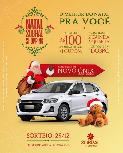 O melhor presente de Natal para você! Que tal concorrer a um novo Onix zero quilômetro? Para participar é fácil, a cada R$100,00 em compras você pode trocar por 1 cupom. E o melhor, de segunda a quarta, os cupons são em dobro! Confira o regulamento no nosso site. #SobralShopping #OSeuShopping #Sobral #Natal #Sorteio