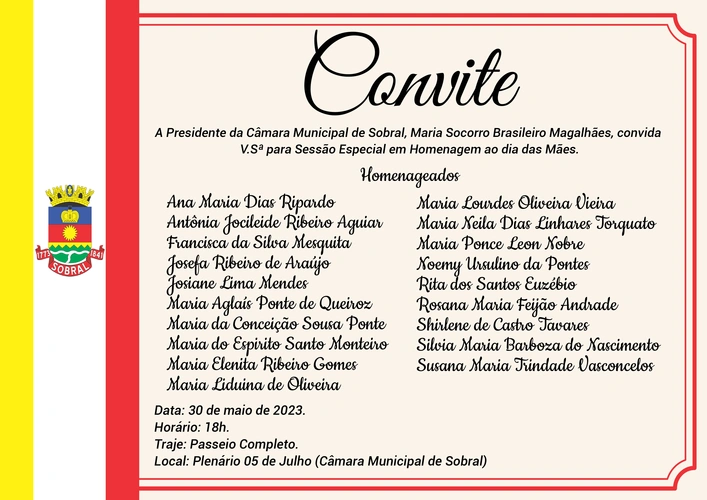 Nessa terça-feira (30), estarei no Plenário da Câmara Municipal de Sobral, para a solenidade em homenagem ao Dia das Mães. Dentre as homenageadas estará a empresária Dona Conceição Ponte.