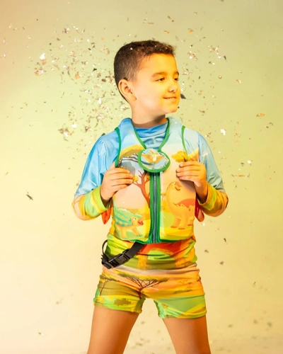 Colete flutuante com zíper e trava de segurança inferior para melhor proteção da criança durante o banho. 😍🦕