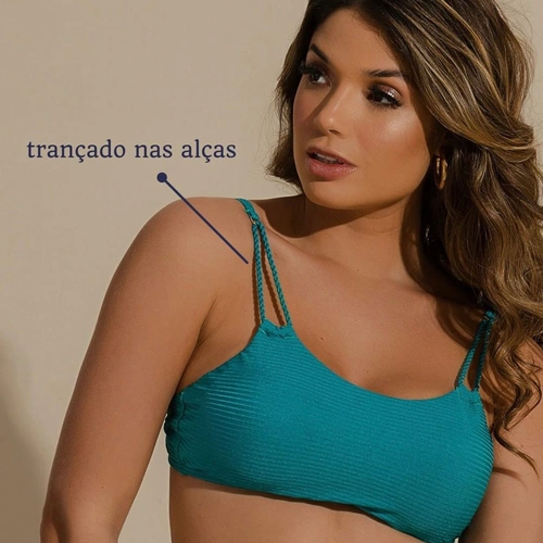 O decote reto é uma tendência que ganhou força nas últimas temporadas e continua em alta nesse verão. Esse decote tem um shape clássico e no nosso biquíni ganha uma releitura com alças em torçal, calcinha com detalhe franzido na pala que garante assimetria ao look e tecido com efeito canelado e brilho.