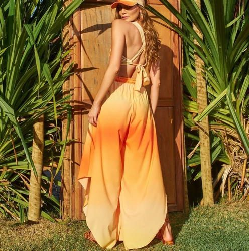 Calça com tecido porcelana. O modelo traz a elegância ao dia na praia, valorizando e modelando o corpo com leveza. ✨🧡