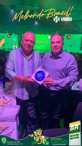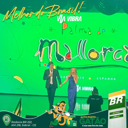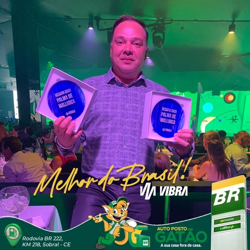 Empresários José Arthur e Felizardo Neto, recebem prêmio em Palma de Mallorca, na Espanha. O Auto Posto Gatão foi eleito como o melhor posto BR do Brasil e melhor conveniência BR Mania e recebem premiação dupla.