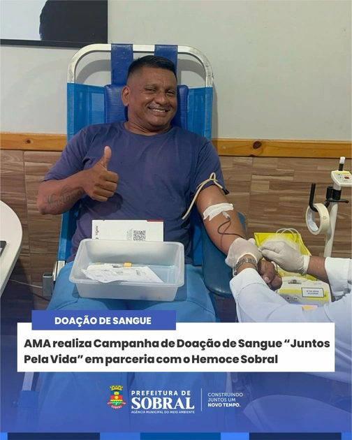A Agência Municipal do Meio Ambiente de Sobral (AMA), da Prefeitura de Sobral, em parceria com o Centro de Hematologia e Hemoterapia do Ceará (Hemoce Sobral), promoveu na segunda-feira (14/04) a Campanha de Doação de Sangue “Juntos Pela Vida”. A coleta foi realizada das 8h às 16h, arrecadando bolsas de sangue que serão destinadas a atender a rede hospitalar da região. A ação contou com a participação de servidores da AMA e voluntários da população sobralense, reforçando o compromisso coletivo com a solidariedade e o salvamento de vidas.