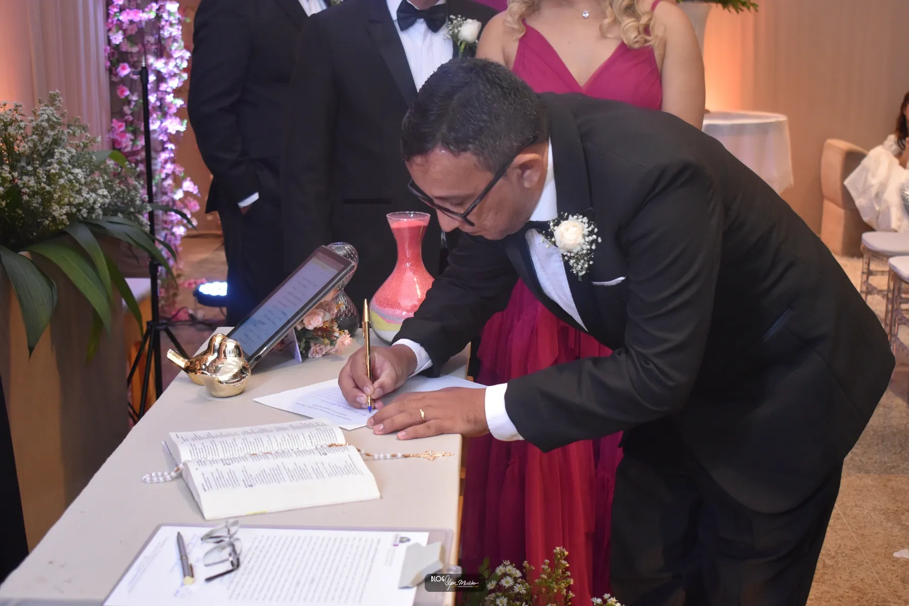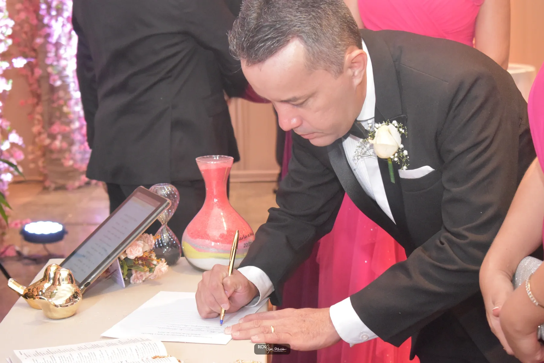 A entrada triunfal do noivo foi na companhia da sua mãe Lúcia Parente, que por sinal estava chiquérrima.