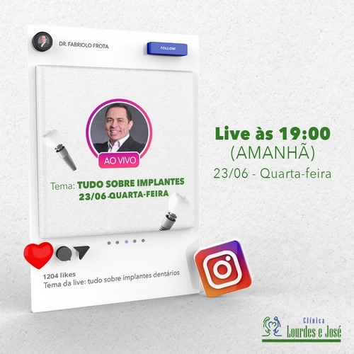 (Foto: Reprodução) Hoje as 19h estarei com a equipe do Notícias de Sobral na transmissão da live na Clínica Lourdes e José com o famoso Dr. Fabríolo Frota. Com o tema Implantes Dentários. Conto com sua participação!