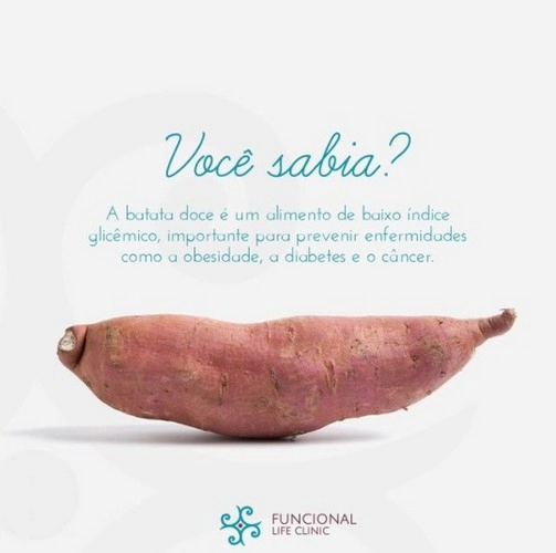 (Foto: Reprodução) A batata doce é um alimento de baixo índice glicêmico, importante para prevenir enfermidades como a obesidade, a diabetes e o câncer. Dra. Ismênya Linhares – Funcional Life Clínic Rua Tabelião Antônio Almeida, 359 (ao Lado Igreja São Francisco) – Centro – Sobral-CE. WhatsApp: (88) 9.9780-1000