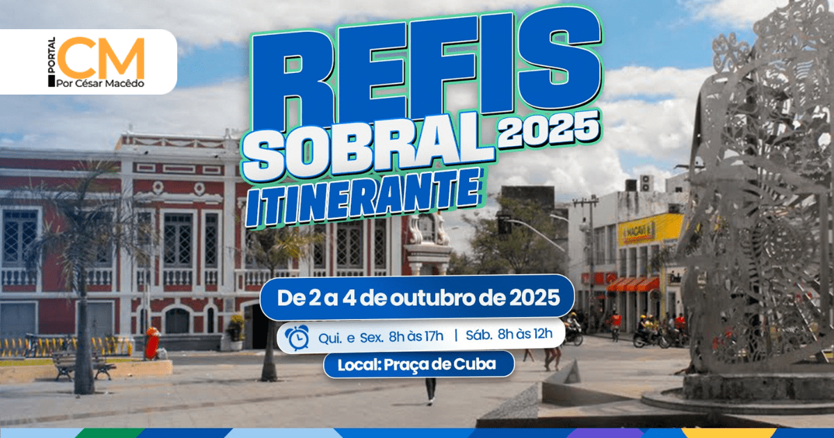 (Imagem: Reprodução) A Prefeitura de Sobral, por meio da Secretaria das Finanças (Sefin) e da Agência Municipal do Meio Ambiente (AMA), realiza, de 2 a 4 de outubro, mais uma edição do REFIS Itinerante, desta vez na Praça de Cuba, no Centro da cidade. A iniciativa tem como objetivo facilitar o acesso dos contribuintes ao […]