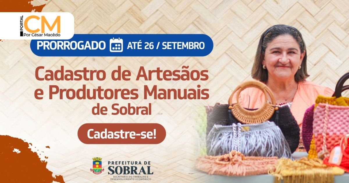 (Imagem: Reprodução) A Prefeitura de Sobral, por meio da Secretaria do Trabalho e Desenvolvimento Econômico (STDE), prorrogou até o dia 26 de setembro o prazo para o Cadastro de Artesãos e Produtores Manuais do município. A prorrogação pretende dar uma maior oportunidade de participação aos trabalhadores dos distritos, ampliando o alcance da iniciativa. Atualmente, estima-se […]