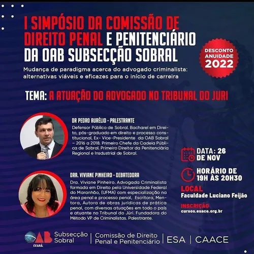 (Foto: Reprodução) Dia 26 de novembro as 14 horas, acontece o Simpósio de Direito Penal na Faculdade Luciano Feijão, com o tema: A atuação do advogado no Tribunal do Júri. Convido você advogado e advogada, acadêmicos de direito para participar deste grande evento com grandes nomes na área criminal para conhecer a minha trajetória atuante […]