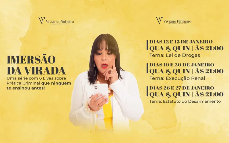 (Foto: Reprodução) A Imersão da Virada 2022 será uma série com 6 lives sobre prática criminal que ninguém te ensinou antes. Acontecerá no meu Instagram @vivianepinheiroadv em meu perfil sempre às 21:00! A primeira live será sobre o tema Lei de Drogas, transmitida nos dias 12 e 13 de Janeiro. Eu abordarei todos os tópicos, […]