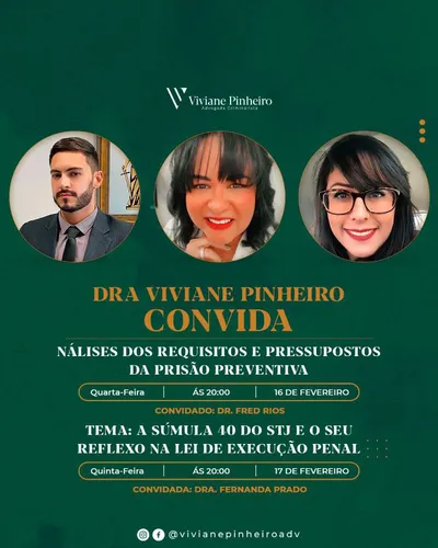 (Foto: Reprodução) Você está convidado para assistir duas lives incríveis no perfil da Advogada Criminalista Dra. Viviane Pinheiro. Sendo hoje sua convidada Dra. Neirilane Roques, com o tema “A Importância e os Desafios da Advogada Criminalista” e amanhã o convidado Saull Ximenes com o tema “Violações das Prerrogativas Dentro de um Flagrante”. Não percam!