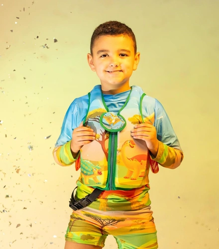Colete flutuante com zíper e trava de segurança inferior para melhor proteção da criança durante o banho. 😍🦕 Confira essa e outras peças aqui na Acqua Moda Praia! (Fotos: Reprodução – Instagram @acquamodapraiaa)