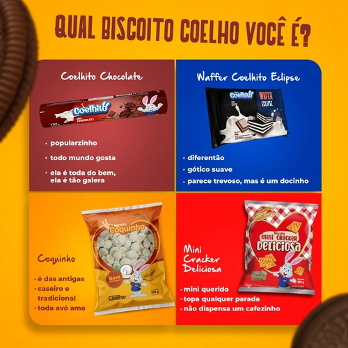 Todo biscoito Coelho tem uma característica marcante que te faz amar cada pedacinho e agora queremos saber: qual é o nosso sabor que te representa mais? 😂 Conta pra gente aqui nos comentários que estamos curiosos para saber! #BoraBiscoitar #BiscoitosCoelho #Coelho #Coelhito #Waffer #Eclipse #Coquinho #MiniCracker
