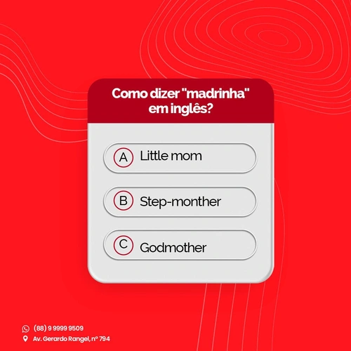 Como dizer “madrinha” em inglês? Essa aqui pega muito gente! E aí? Qual a resposta correta? Não sabe? Quer aprender? Agenda uma aula experimental e vem aprender com a @fisksobral inglês! 😉 (link na bio!) (Fonte: Instagram @fisksobral)