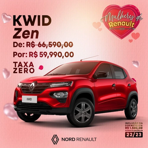 Vamos lá mulherada… vocês merecem um #Renault 😍! Kwid Zen, por R$ 59.990,00 e Taxa Zero! *Inclusão da cor metálica por R$ 1.500,00, somente nos modelos 22/23