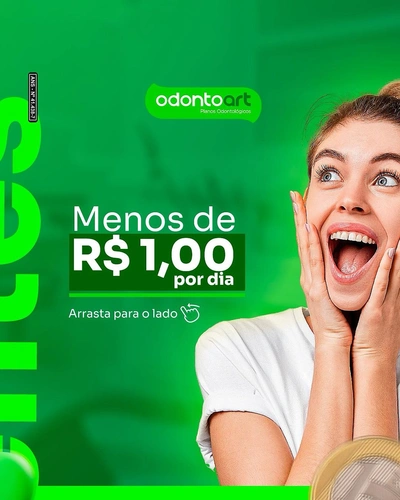 Economize com o plano Odontoart! Por menos de 1 real por dia, você recebe atendimento odontológico de qualidade e ainda evita gastos imprevistos. 💚🦷 (Imagens: Reprodução – Instagram @odontoartplanos)