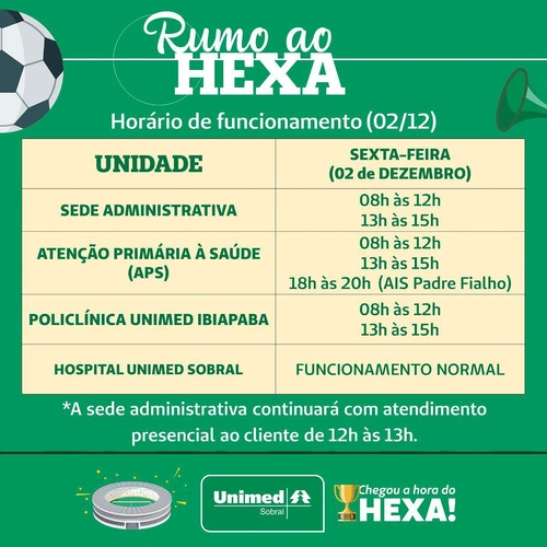 Confira o funcionamento da Unimed Sobral no dia do Jogo do Brasil – 02 de dezembro às 16h. 🇧🇷 Em caso de dúvidas, entre em contato pelo SAC 24h: 0800 280 5358 ou acesse: www.unimedsobral.com.br Vamos juntos na Torcida! 📣💚 #unimedsobral #sobral #tianguá