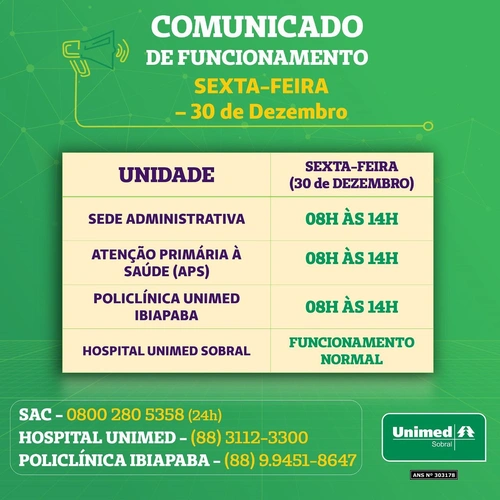 Confira o funcionamento da Unimed Sobral nesta sexta-feira dia 30 de dezembro. ⠀⠀⠀⠀ Em caso de dúvidas, entre em contato pelo SAC 24h: 0800 280 5358 ou acesse: www.unimedsobral.com.br #unimedsobral #sobral #tianguá
