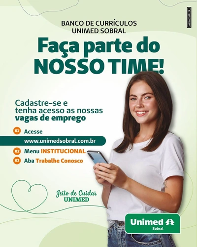 Faça parte do nosso time! 💚 Banco de currículos Unimed Sobral Cadastre-se e tenha acesso as nossas vagas de emprego! #jeitodecuidarunimed