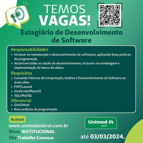 Oportunidade Operadora Unimed Sobral – Estagiário de Desenvolvimento de Software Envie seu currículo através do link: https://unimedsobral.vagas.solides.com.br/vaga/361641 (link nos stories) #UnimedSobral#TI#Estagio