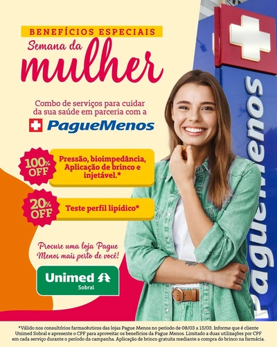 Celebre a sua saúde na Semana da Mulher com benefícios exclusivos oferecidos pela Unimed Sobral em parceria com a Pague Menos! Pensando no seu bem-estar, preparamos um combo especial de serviços para cuidar de você com todo o carinho que merece: 🌟 100% OFF: Pressão, bioimpedância, Aplicação de brinco e injetável.🌟 20% OFF: Teste perfil […]