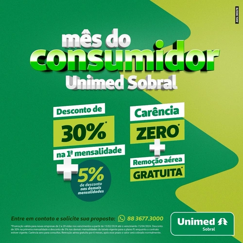 Tenha 6x mais benefícios com a Unimed Sobral: ✅ 15% de desconto na 1ª mensalidade;✅ 5% de desconto na mensalidade;✅ 10% de desconto na 10ª mensalidade;✅ CARÊNCIA ZERO para consultas;✅ Redução de carência para exames;✅ 6 meses de remoção aérea gratuita. Não espere mais! Entre em contato conosco e garanta para seus colaboradores essas condições! […]