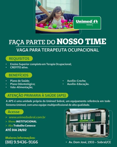 Vaga para Terapeuta Ocupacional! Unimed Sobral em Sobral-CE! ⠀⠀ Para se candidatar a vaga: Entre no site www.unimedsobral.com.br -> Menu “Institucional” -> Aba “Trabalhe Conosco” -> Banco de Talentos -> “Cadastrar” e preencha seu currículo até o dia 28/02/23. Mais informações: (88) 9.9436-9166