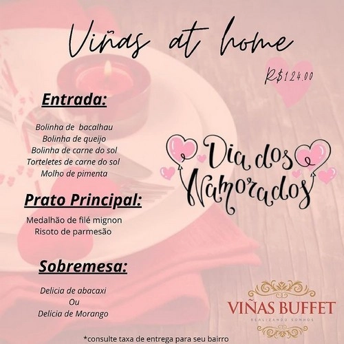 (Foto: Reprodução) O Viñas Buffet já está organizado com seu cardápio para o Dia dos Namorados. Faça já sua encomenda! VIÑAS AT HOME. Escolha seu menu e comemore essa data especial ao lado de quem você ama. Encomendas antecipadas pelo nosso WhatsApp (88) 9.9910-0717, até dia 10/06.