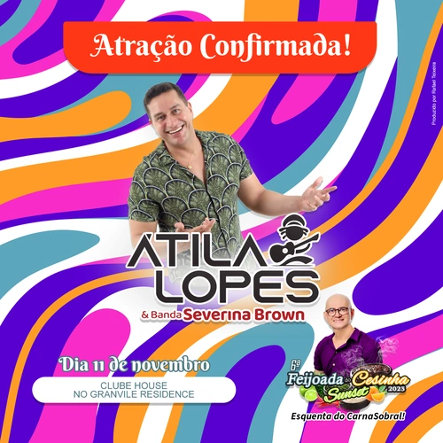 Átila Lopes & Banda Severina Brown é “Atração Confirmada” para a 6ª Feijoada do Cesinha. Venha fazer parte desta festa maravilhosa que já virou tradição no calendário de Sobral e Região! Sábado dia 11 de novembro no Club House do Granvile Residence.