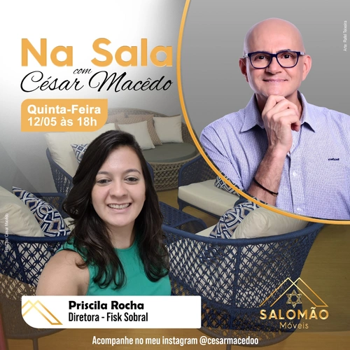 (Arte: por Rafael Teixeira) Nossa entrevista para o quadro “Na Sala com César Macêdo” será super diferente e especial, acontecerá nesta quinta-feira, dia 12 de maio, às 18h, e nossa convidada será a Diretora do Fisk Sobral Priscila Rocha! E como sempre será na renomada loja Salomão Móveis! Anota aí e não percam!