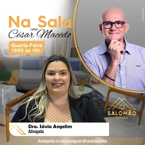 (Arte: por Rafael Teixeira) O quadro “Na Sala Com César Macêdo” desta quarta-feira (18), contará com a participação da Procuradora do Complexo Santa Casa, a Advogada Dra. Sávia Angelim. A entrevista acontece na Loja Salomão Móveis e vai ao ar às 18h no meu perfil do Instagram @cesarmacedoo.