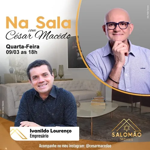 (Foto: Reprodução) Nesta quarta-feira (9), estarei com um novo quadro nas minhas plataformas digitais “Na Sala com César Macêdo”, estreando com o empresário da decoração Ivanildo Lourenço, na loja Salomão Móveis, localizada na Avenida Dom José, 783, próximo ao Hospital Dr. Alves. Nosso quadro irá ao ar todas as quartas-feiras, as 18h no meu perfil […]
