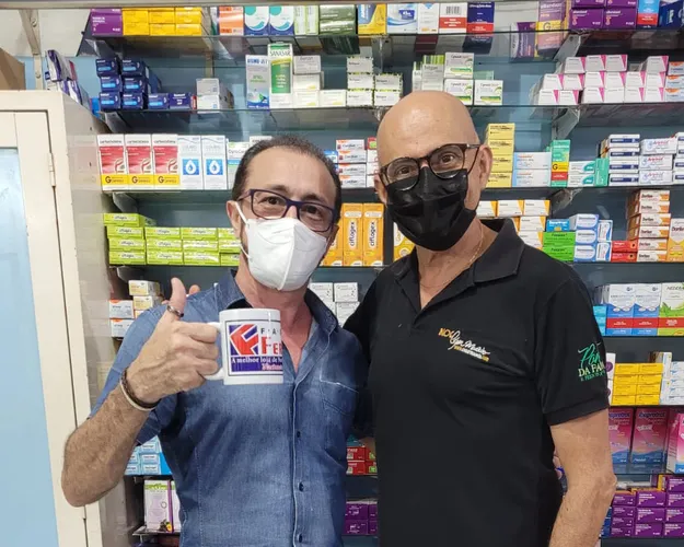 (Foto: Reprodução) Estive na Farmácia Fernandes parabenizando meu precioso amigo Antônio Fernandes e lhe presenteando com um mimo da @inspiracaotshirtsecanecas