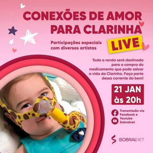 LIVE “Conexão de amor para Clarinha”, com participações especiais com diversos artistas. Dia 21 de janeiro (quinta) às 20h. Transmissão no Facebook e YouTube da SobralNet. Toda a renda será destinada para a compra do medicamento que pode salvar a vida da Clarinha. Faça parte dessa corrente do bem! Clarinha tem uma doença neuromuscular degenerativa […]