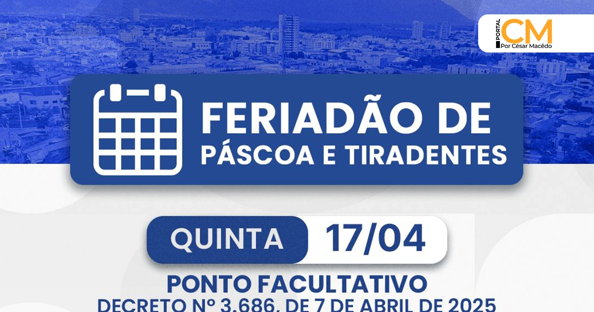A Prefeitura de Sobral decreta ponto facultativo na quinta-feira (17/04) e não haverá expediente em virtude da celebração da Quinta-Feira Santa, que integra as celebrações da Semana Santa. Além disso, será feriado nacional na Sexta-feira Santa (18/04) e na Segunda-feira (21/04), Dia de Tiradentes. O decreto nº 3.686, de 07 de abril de 2025 aponta […]