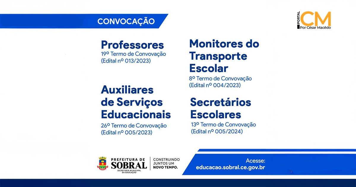 A Prefeitura de Sobral, por meio da Secretaria Municipal da Educação (SME), publicou nesta segunda-feira (07/04) mais quatro termos de convocação para profissionais aprovados em processos seletivos. Estão sendo chamados 39 candidatos aprovados nos editais nº 004/2023, nº 005/2023, nº 013/2023 e nº 005/2024. A convocação visa suprir demandas dos equipamentos da rede municipal de […]