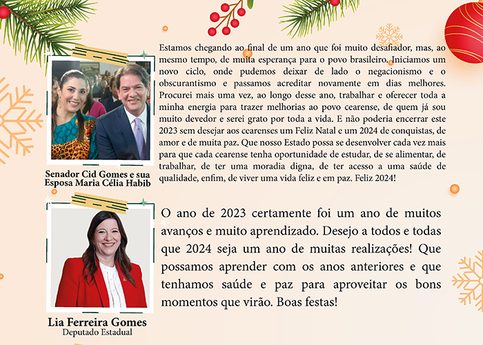 Confira a página com as Mensagens de Final de Ano das autoridades, na nossa 6ª Edição da Revista César Macêdo Acontece. (Diagramação: por Sáulus Cordeiro)