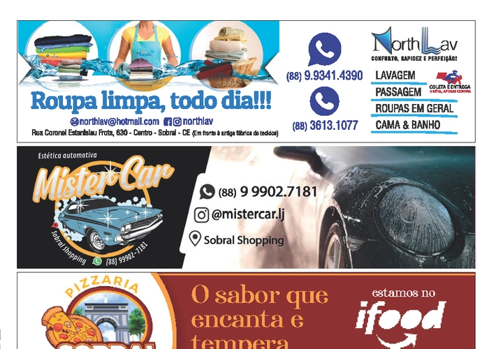 Confira a página das conceituadas empresas anunciantes:- NorthLav, Mister Car, Pizzaria Sobral City, Seta Estágios e Cacto Criativo, nesta 5ª edição da Revista César Macêdo Acontece.