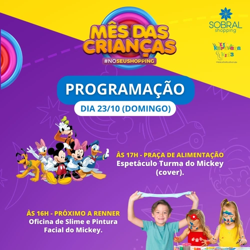 A programação deste domingo (23), está superanimada! Advinha só quem estará por aqui? Se você pensou na Turma do Mickey, acertou! Ele e sua turma estarão fazendo um espetáculo (cover) gratuito para a criançada a partir das 17h, na praça de alimentação. E ainda neste dia, a partir das 16h, estará acontecendo uma Oficina de […]