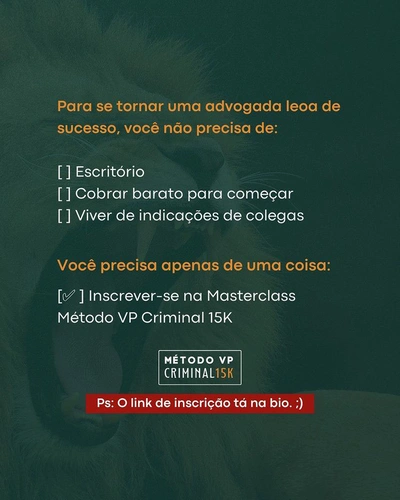 (Foto/Imagem: Reprodução – Instagram @vivianepinheiroadvogada) Quinta-feira, dia 02 de junho, acontecerá a aula que poderá mudar sua vida! Últimos dias para você garantir sua vaga na Masterclass Método VP Criminal 15K. Neste evento ao vivo e gratuito você irá aprender a alcançar os R$ 15.000,00 de faturamento mensal, com base em um método que eu […]