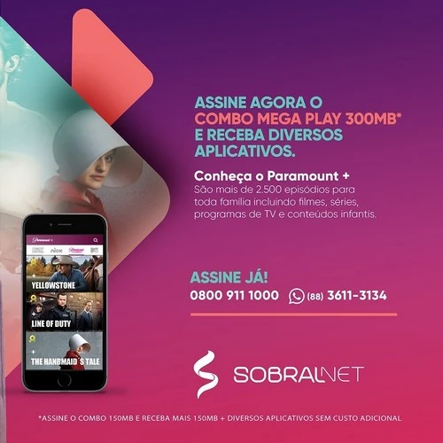 No mês de aniversário da nossa cidade, temos vários combos de presente para você! Na assinatura do COMBO MEGA PLAY*, você terá 300MB por apenas R$ 99,90 e também leva sem custo adicional diversos serviços online, entre eles o Paramount Mais, streaming com sucessos do cinema e diversas séries. Tem programação para todas as idades. […]