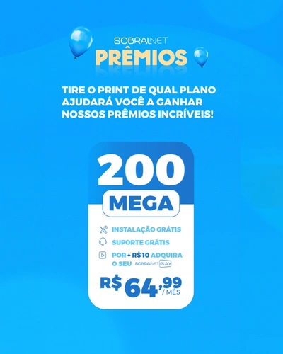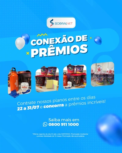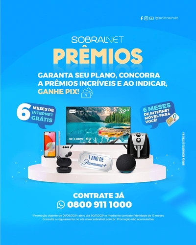 Quer ganhar prêmios incríveis e ainda faturar um PIX? É fácil! Participe da nossa nova promoção: ao garantir um plano você concorre a incríveis prêmios e ao indicar, você ganha PIX. Consulte o regulamento no site www.sobralnet.com.br. Saiba mais em 🟢📞 0800 911 100 Não perca essa oportunidade de ganhar e comemorar com a gente! […]