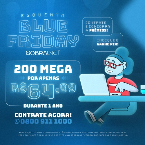 É hora de se aquecer com a nossa Blue Friday Sobralnet! Garanta 200 MEGA por apenas R$ 64,99 durante 1 ano! Ao contratar, você ainda concorre a prêmios incríveis do Sobralnet Prêmios e ganha PIX ao indicar alguém para contratar! Saiba mais em 🟢📞 0800 911 1000 ou clique no 🔗 link da bio. #blackfriday#blue#sobralnet#sobral#prêmios#pix