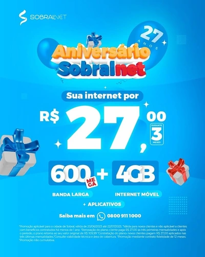 Celebre conosco! Venha fazer parte da Família Sobralnet e comemorar nosso 27º Aniversário! Descubra todas as ofertas incríveis. Conecte-se com a melhor internet e aproveite a experiência premium que oferecemos! #Sobralnet27Anos #InternetDeQualidade #ConectividadeTotal