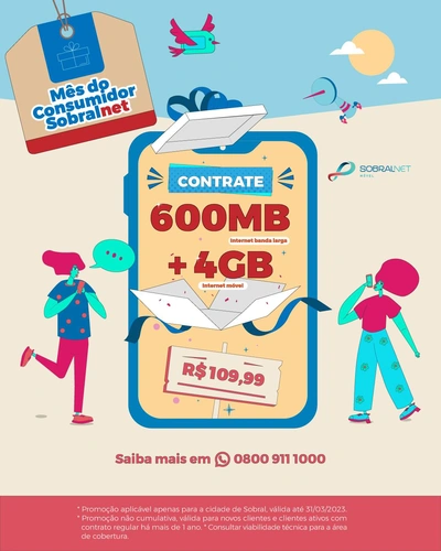 Conecte-se com o melhor da internet no mês do consumidor! Aproveite a promoção especial e assine agora 600 MEGA Banda larga + 4 GB de Internet móvel por apenas R$ 109,99. Não deixe essa oportunidade passar! *Promoção válida até 31/03/2023. Saiba mais em nosso 💚WhatsApp 0800 911 1000 #Sobralnet #Sobral #Conexão #suaoperadoramóvel