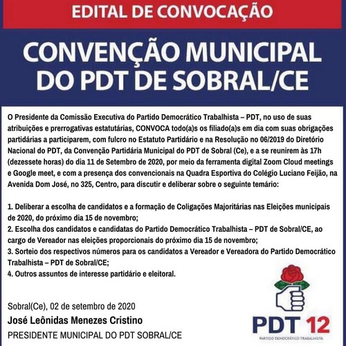 Estarei presente nessa sexta dia 11 de Setembro as 17h. prestigiando a convenção do PDT na quadra esportiva do colégio Luciano Feijão.