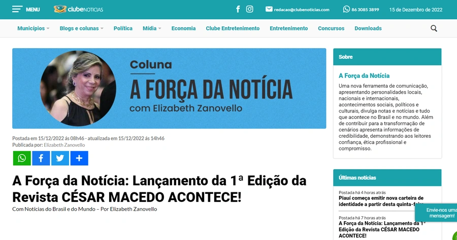 O Lançamento da 1ª Edição da Revista César Macêdo Acontece foi notícia na coluna “A Força da Notícia, pela jornalista Elizabeth Zanovello”. Confira no link a seguir: A força da Notícia