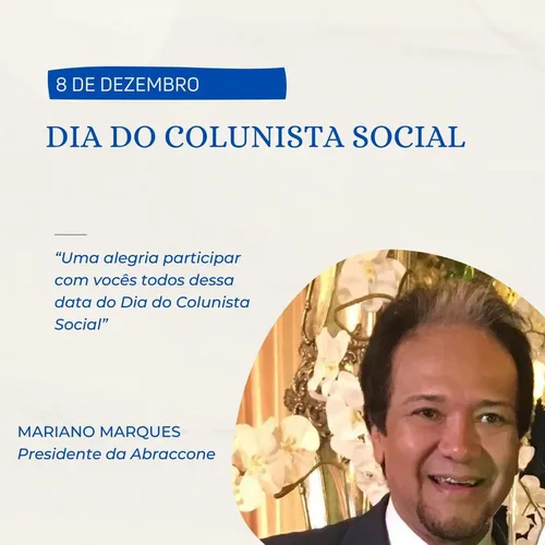 (Foto: Reprodução) Hoje, dia 8 de dezembro é comemorado o dia do Colunista Social. Em nome do presidente da ABRACCONE, o apresentador Mariano Marques, da vice-presidente Jaciara Barros, do diretor de comunicação Fábio Teles e da minha preciosa amiga, a jornalista Elvira Raulino presto minhas homenagens a todos os Colunistas Sociais do Brasil, em especial […]