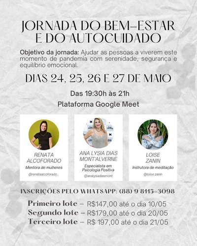 (Foto: Reprodução) Começa hoje e vai até o dia 27 de maio essa maravilhosa Jornada. Com a participação da Renata Alcoforado, Ana Lysia Mont’Alverne e Loise Zanin. Confira!