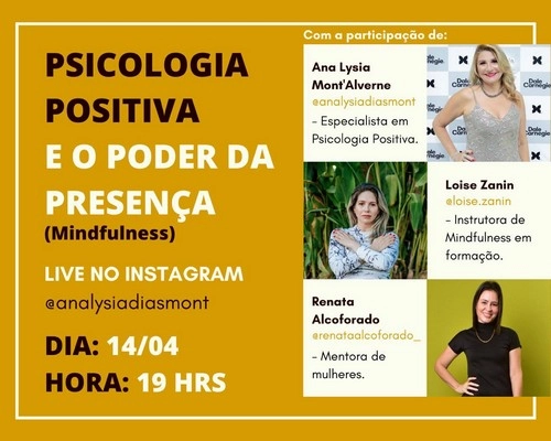 Foto: Reprodução Dia 14 de abril convido a todos para acompanhar essa maravilhosa Live. Com a organização de Ana Lysia Mont’Alverne e a participação de Loise Zanin e Renata Alcoforado.